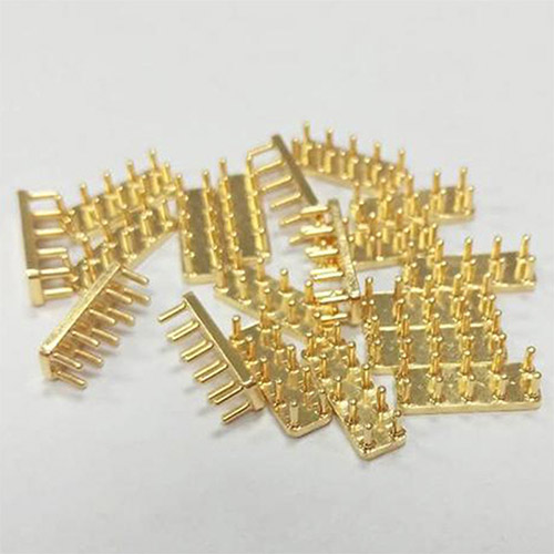 銅柱壓件鍍厚金的過程一般是通過電化學方法完成的。首先,將銅柱壓件作為陽極,將金作為陰極,放置在含有金鹽的電解液中。然後,通過通電,金離子會在銅柱壓件的表麵還原成金屬金,形成厚金層。